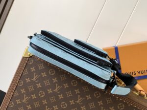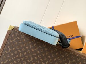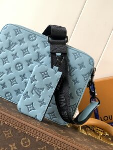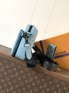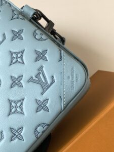 Light Blue, Top-grade Original, Variable Chip 163c. This Trio messenger bag is crafted from Monogram Hr embossed cowhide leather. The zippered front pocket and small coin purse on the shoulder strap are both removable, adding to the main compartment’s functional design. The removable and adjustable jacquard fabric shoulder strap is branded for comfortable shoulder and crossbody use. Dimensions: 25 x 18.5 x 7 cm