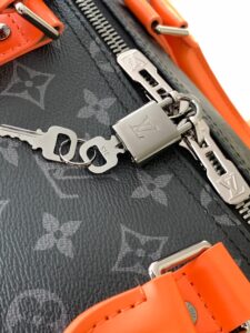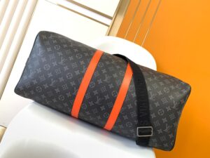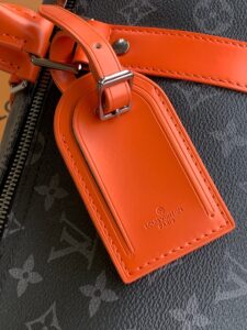 M15253 Black Floral Tangerine 55cm 163c01 Variable Chip Keepall 55 Travel Bag is crafted from Monogram Eclipse canvas with a vibrant leather accent on the wings, sides, and side straps. It features a black detachable, adjustable shoulder strap with a matching lining, as well as an interior zippered pocket for organized storage. This practical model is compact yet spacious, making it ideal as carry-on luggage.